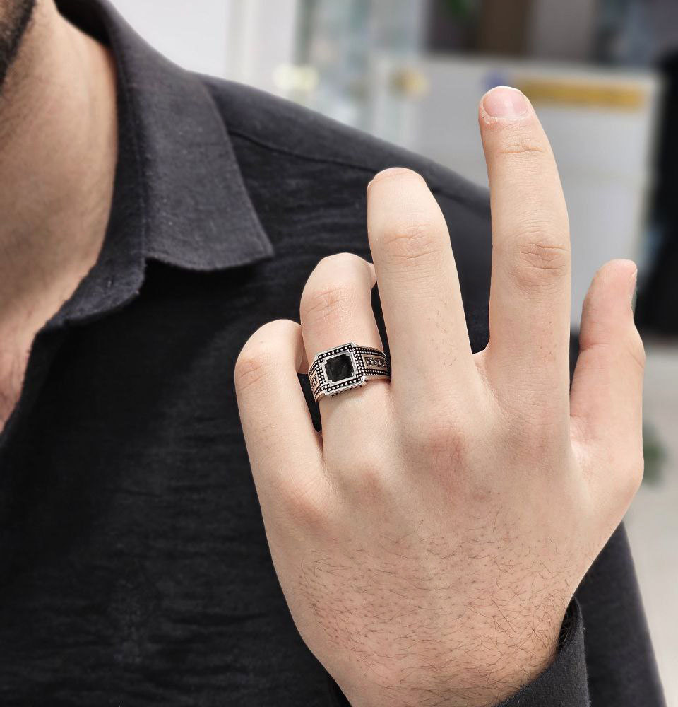 انگشتر نقره مردانه قلم زنی نگین مشکی کد ۱۵۳۶۹
